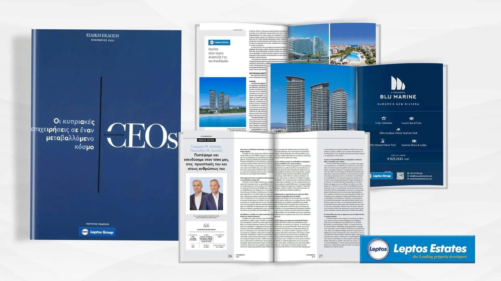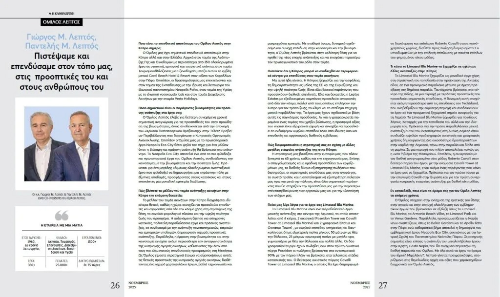 Mr. Pantelis M. Leptos and Mr. George M. Leptos – co-chairmen of Leptos Estates – were recently featured in the CEOs Magazine – Special Edition, November 2025, published by Kathimerini. Below is the full interview.